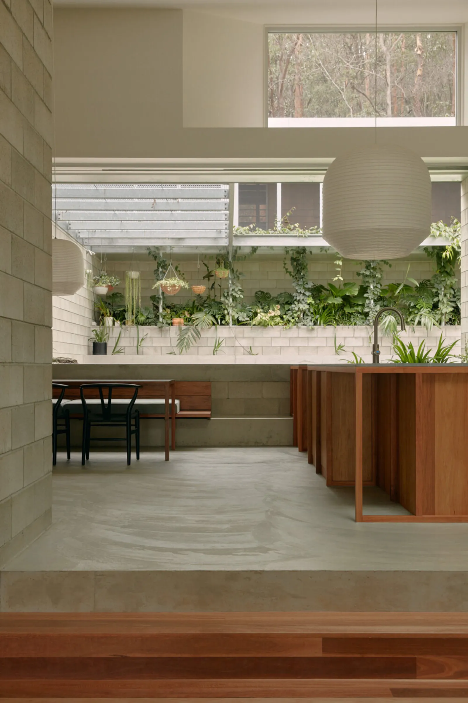 Large apertures, skylights, and light wells invite the outdoors in, creating a dynamic dialogue between shadows, surfaces, and greenery.