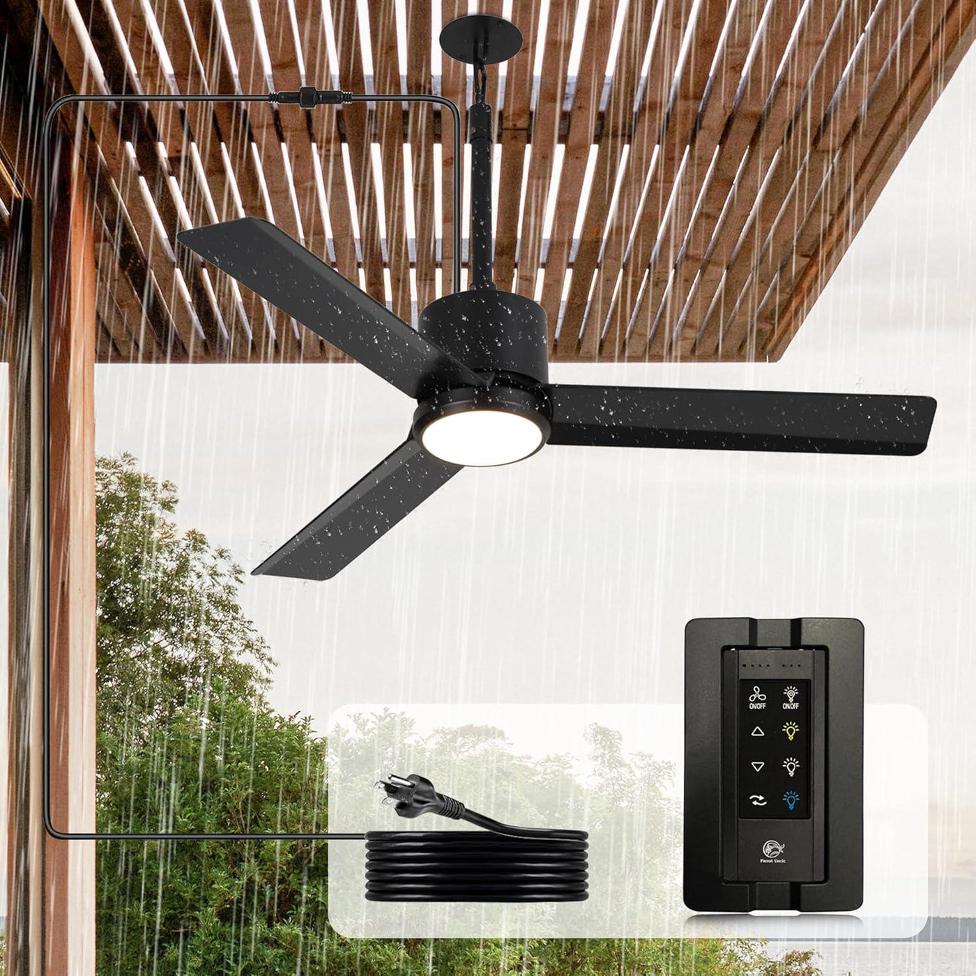 - Wet‑rated: safe where water can drip, splash, or flow on the fan—think open pergolas, poolside, or exposed decks.